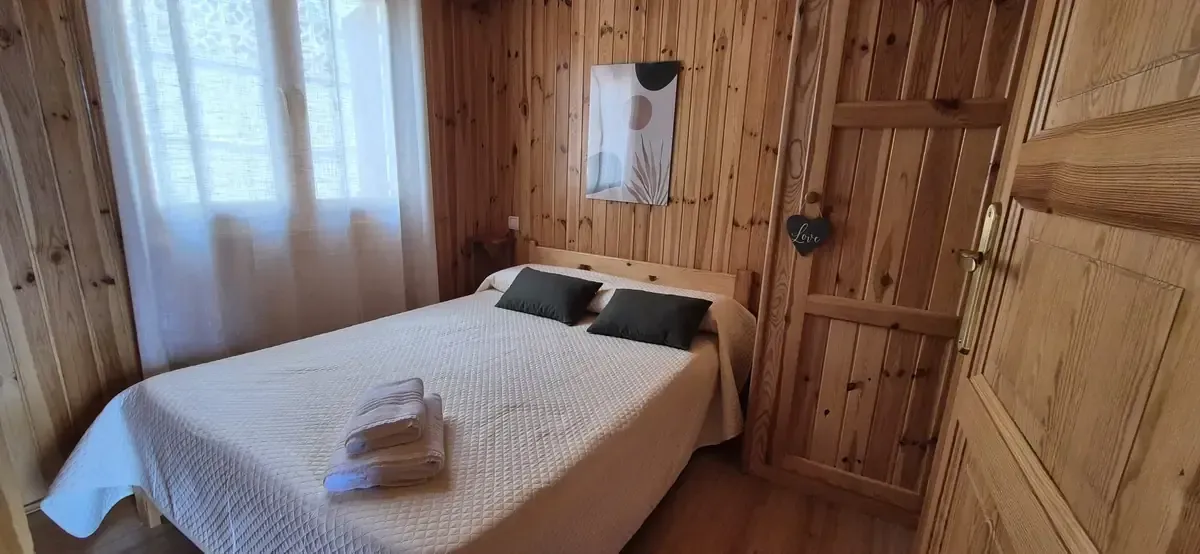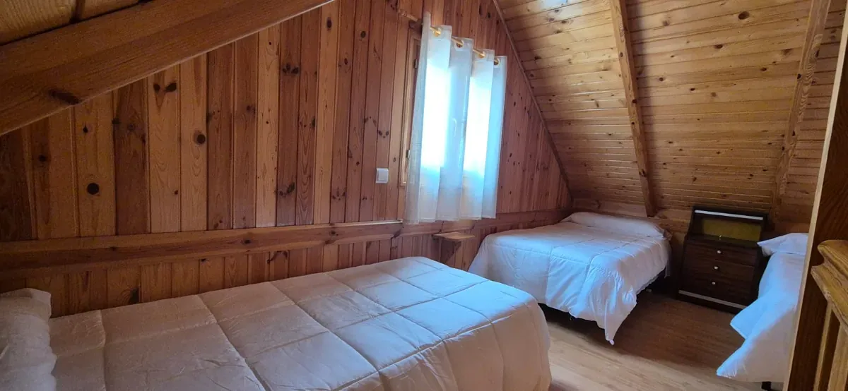 Cada cabaña cuenta con dos dormitorios independientes: uno con cama de matrimonio y otro con camas individuales, ofreciendo una capacidad óptima para alojar a equipos de trabajo. El alojamiento dispone de un baño privado, equipado con ducha, ropa de cama, toallas y todo lo necesario para garantizar una estancia confortable tanto en periodos cortos como prolongados.